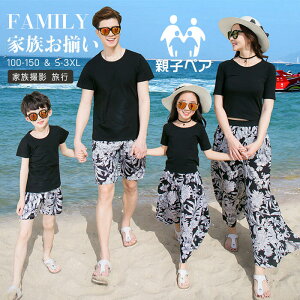親子ペア アロハシャツ 親子コーデ ペアtシャツ セットアップ 夏 半袖 カップル ママ パパ キッズ 男の子 女の子 ガウチョパンツ 花柄 ワイドパンツハワイ海辺旅行 カップル お揃い プ