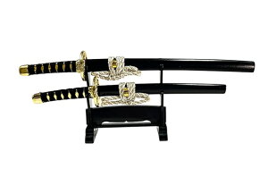 全長:260mm/215mm ■ブレード材:ステンレス ■ハンドル材:プラスチック ■2本掛け台付き ■刃の付いていない模造刀です。 ■鍔に塗装ムラ有り。