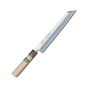 独特の形状をした「切付柳刃」は、通常の柳刃包丁の、ワンサイズ上の物の先端を落として、 厚みと重量を持たせた包丁で、腰があります。 刃渡り260mm、全長395mm、刃幅34.5mm、刃厚2.2mm、重さ240g...
