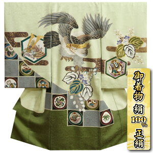 【送料無料】鮮やかな淡い緑色と濃い目の抹茶色の染め分けが個性的な男の子のお宮参り着物です。 鷹の頭の輪郭部分には金駒刺繍の縁取りが入って上品な豪華さもあります。 鷹を中心に兜や宝尽くし文様、桐の華など健康で逞しく育って
