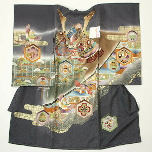 【送料無料】黒地色に鷹や宝船、紋柄などの金彩箔の縁起柄を中心に配された男の子のお宮参り着物です。 鷹の頭部分には金糸刺繍が施してあり、金彩の箔と合わさり上品な豪華さもあります。 敢...