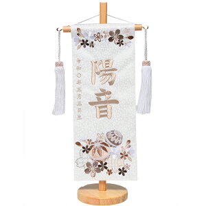 21.5cm 全長 31cm(台付) 白色地の旗に、近年流行のニュアンスカラーで仕上げた刺繍が可愛らしい刺繍名前旗です。 お名前・ご生年月日の刺繍をモカ刺繍にてお仕立てさせていただきます。 白色の飾り房