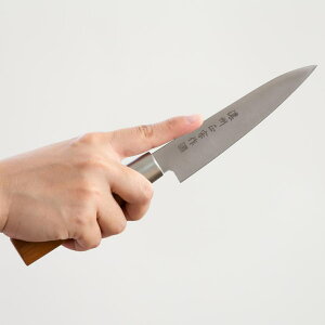 ●江戸時代の刀匠、善定藤原兼次に由来する関兼次刃物株式会社との共同開発により料理庖丁を完成。●刀身をハンドルで挟み込み熔接したため丈夫で折れにくく長持ちします。斬新なデザインで握りやすく、滑りにくい形状です。●両刃●