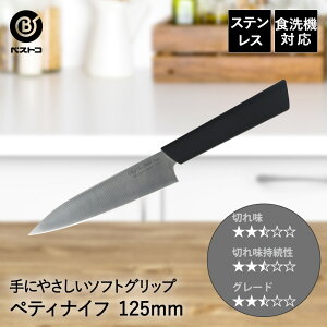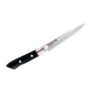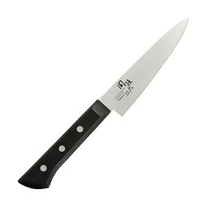 サビに強く切れ味の鋭いモリブデン鋼を割り込んだ高級感のあるペティナイフです。■衛生的で丈夫なツバ付き柄と刃の間にツバがあるので、食材の汁などが入りにくく衛生的です。また、水気が入らない分、柄が傷みにくい構造となってお