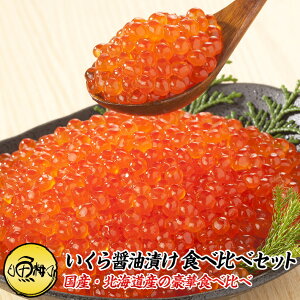 当店人気の国産いくら醤油漬けと、北海道産いくら醤油漬けをお得なセットに致しました。秋鮭から丹念にほぐし、低温のタレに漬け込みました。コクのある素材本来の味をご堪能ください。名称 いくら醤油漬け 産地 国産、北海道産。