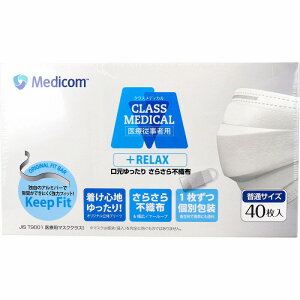 クラスメディカル マスク リラックス 個包装 普通サイズ 40枚入。●口元ゆったりさらさら不織布。独自のアルミバーで隙間ができにくく強力フィット!●着け心地ゆったり!オリジナル立体プリーツ。