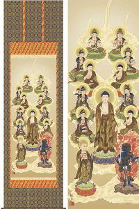 ご先祖様の初七日から三十三回忌まで十三回の追善供養を つかさどる十三佛を一幅におさめた仏画掛軸です。 あらゆる佛事にお飾り頂けるのはもちろん、 ご家庭の安全や家運隆盛を願って日常掛けとしてもお掛け下さい...