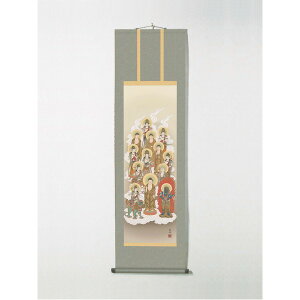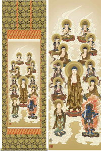 ご先祖様の初七日から三十三回忌まで十三回の追善供養をつかさどる十三佛を一幅におさめた仏画掛軸です。あらゆる佛事にお飾り頂けるのはもちろん、ご家庭の安全や家運隆盛を願って日常掛けとしてもお掛け下さい
