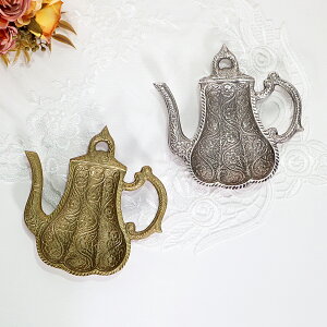ティーポットをモチーフにした真鍮製のトレイ。 繊細な彫刻模様が全面に施され、アンティーク調の深みのある輝きが魅力です。 玄関やドレッサー、サイドボードなどに置くだけで、まるで海外アンティークのような雰囲気に。お気に入り