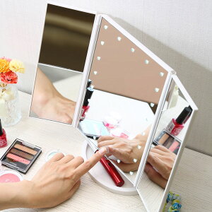 LEDライト付き折り畳み三面鏡暗い場所でもお顔を明るく照らしてくれる 8つのLEDライト付きのコンパクト三面鏡です。お出かけ先や、日当たりの悪いお部屋でも、楽屋の鏡のようにライトアップしてくれるから、快適にメイクアップをお楽し