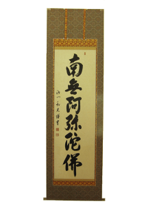【六字名号 掛け軸】 仏教の真髄を会得した名刹和尚直筆の名品 作者・・・・・・・中田 逸夫 寸法・・・・・・・190cm×54・5cm 表装・・・・・・・洛彩緞子佛表装 用途・・・・・・・仏事用 軸先・・・・