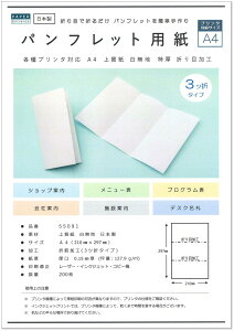 用紙 上質紙 ※国内製紙メーカー品 サイズ/紙厚 A4(297mm×210mm) / 0.15mm厚(坪量:127.9g/m2) 加工 折り目加工(A4サイズ3等分) 用途 パンフレット・プログラム・メニュー...