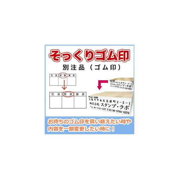 【こちらの商品はパソコン版での閲覧を推奨しております】 そっくりゴム印とは、 例えば ・現在使用しているゴム印と同じものがほしい ・現在使用しているゴム印の文字が一部変更したものがほしい ・大量にゴム印が必要になった<