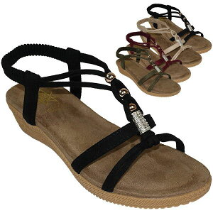 ■ 商品説明すっきりとシンプルなデザインで夏にぴったりの一足です。スエード調で落ちついた色目のアッパーには3連パーツとビジューをバランスよく飾り華やかさをプラスしました。ほどよい傾斜のウェッジヒールは疲れにくくスエー