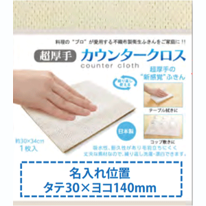 超厚手カウンタークロス 日本製 入り数50枚 袋サイズ 175×155×3mm 材質 レーヨン90% ポリエステル10% 商品サイズ 300×340mm 名入れ箇所 30×140mm ※別途費用がかかります