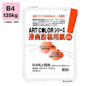 描き味を追求した漫画専用上質紙を使用。紙はピュアホワイトで、枠線・目盛りはブルー(水色)で印刷されています。投稿用 B4判(257×364mm)上質紙135kg/35枚入