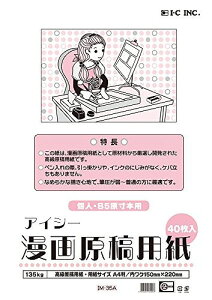 ●IC漫画原稿用紙●110kgA4,用紙サイズ210mm*297mm、筆圧が普通〜弱い方向け、個人、B5原寸本用、40枚入●JANコード:4958259105006※商品コード:491-00874