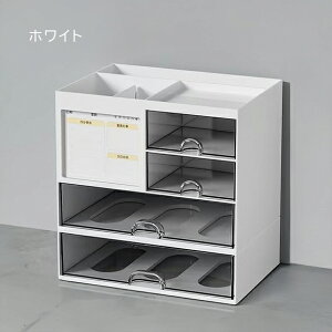 見せる収納で、デスクが一気におしゃれになる卓上収納ボックス。 ホワイトにクリア風のシンプルなのにおしゃれなデザイン。 収納力もバッチリなスッキリまとめる引き出し付き構造です。 文房具・メイク道具・スキンケア・