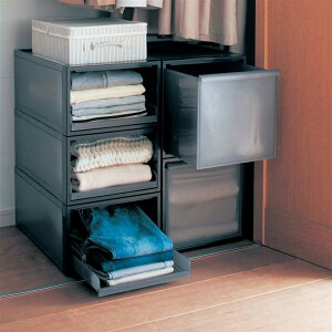 クリアブラック ●ちょっと着ただけの服を一時置きできるトレータイプは、前板がないので通気性があります●引出しタイプもほんのり中が透けて見えるのでどこに何を収納したかひと目でわかりやすい●使用頻度や使い方