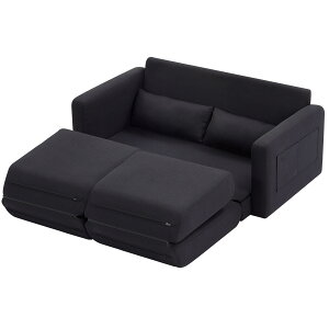 品は、2人掛けソファと背もたれのない1人掛けソファで構成されており、自由に配置を変えることができます。///ソファベッドへの変形:2人掛けソファの背もたれは簡単に倒すことができ、ソファ