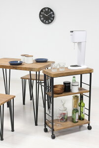 トップの天板は厚み約37mmで高級感。 ●木調とスチールが融合したデザインがスタイリッシュ。 ●コンパクトでもたっぷり収納。 ●中段の棚は可動式。(5か所可動) ●キャスター4