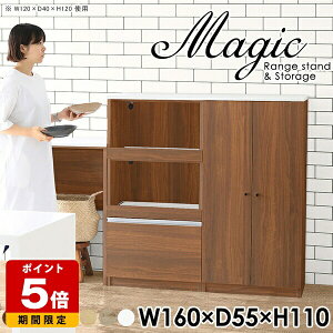 magic レンジ台×収納庫 W160×D55×H110 木目サイズサイズ:約幅1600 奥行き550 高さ1100 mm材質[天板・スライド棚]メラミン樹脂化粧合板[前板]ブラウン・ダークブラウン・...
