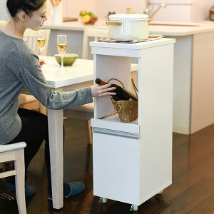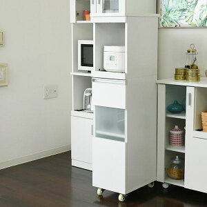 家電の収納に便利なコンセント付きスライド棚と、収納物に合わせて高さ調節ができる可動棚付きの食器棚をこれ1台で。ロータイプは天板も使いやすいちょうど良い高さ。キッチンのちょっとした隙間に設置すれば、それまでのデッドスペー