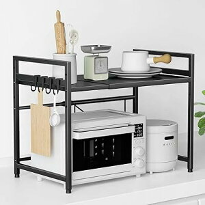 レンジ上ラック 棚板高さ調節可 トースター収納 電子レンジ棚 多機能ラック レンジ置き台 伸縮式 省スペース 幅41~64cm 耐荷重50kg キッチン収納 フック8個付き (ブラック, 二段式)ブラ...