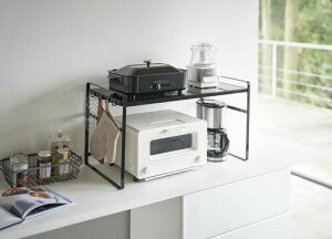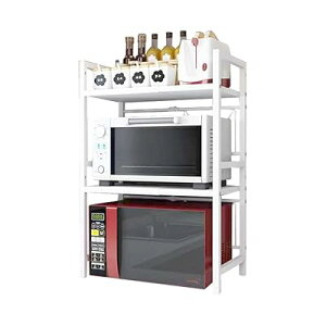 縮式電子レンジ上ラック◇スタッキング可能で複数の家電を収納、食品・調味料などを置く事も。◇側面に6つのフックが付いていてキッチンツールや小物の収納に便利