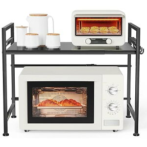 カラー:ブラック◆商品名:レンジ上ラック トースターラック キッチン収納 伸縮式 幅(40-60cm)棚板高さ調節可 電子レンジ 台 耐荷重50kg フック5つ付き お洒落 収納ラック【商品仕様】:サイズ(約):幅40~60*奥行32...