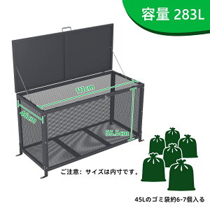 サイズ:1200×600×1000mm 完成品:アンカーのみ組み立て必要 色:黒 材質:カーボンスチール 容量:720L/ごみ袋(45L)約16袋(約8世帯分) 用途:家庭ゴミの仮保管、ガーデニング用品・小物入れなどにご使用いただけ