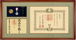 仕上げました。 勲記勲章周りの布貼りはそのままに、コンパクトに飾りたい方にお勧めです。 【叙勲額縁】 ■額外寸:高さ53.3cm×幅88.4cm×厚さ6.5cm ■賞状寸法:42cm×59.4cm...