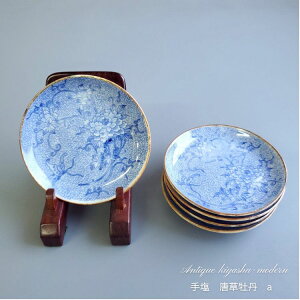 1.8cm素材陶器特徴昭和初期 印判天塩皿5枚組でございます。 見込みに描かれた唐草と牡丹の色合いをお楽しみくださいませ。 〜スタッフ福ちゃん 一口メモ〜 ?唐草の云われ? 生命力が強く途切れることな