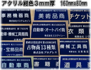 紺色 壁掛け用穴ありタイプ 本体サイズ:W160×H80mm 1.公安委員会名: 2.許可番号: 3.商名: 4.法人名(法人許可)・許可者氏名(個人許可): ご購入時ギフトメーセージにてご入稿いただくか、ご購入後注文番号付きメール:...