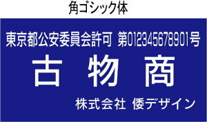 法律で定める様式に準拠した古物商プレート、標識(古物営業法施行規則第11条、別記様式第13号)※古物市場主も対応可能です 素材:アクリル製 カラー:紺色 サイズ:約160mm×80mm オーダーメイド...