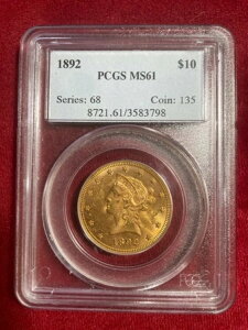 1892 $10 GOLD Liberty PCGS MS61商品について販売者コメント「MS61 素晴らしい色彩で、見た目も非常に魅力的」額面:10ドル流通/非流通:非流通材質:金発行年:1892年刻印:ビジネス純度:0.9グレード...