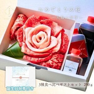 人気部位を贅沢に詰め合わせた、贈答用に最適な焼肉セット! 5種類のお肉で作った、花のギフトをご用意しました。 自家製のタレ3種もセットになっているので、ご自宅で本