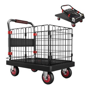 【2WAY高い便利性】カゴ付き台車の防落フェンスは簡単取り外し可能で、即座に平板カートに切り替わる。折り畳み時は90x60x16とコンパクトで、荷物の形・量に合わせて使い分け、布団など不規則荷物も安心運搬...