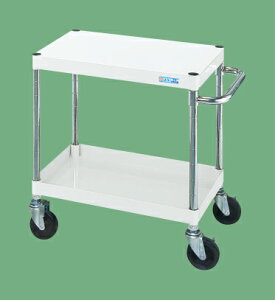 ●外寸:W600×D400×H600mm●均等耐荷重:100kg●本体色:ダークグレー●質量:9kg●キャスター:75φナイロンウレタン車●段数:2●支柱:クロムメッキ25.4φ、棚板調整ピッチ50mm●改正RoHS10物質対応