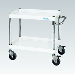 ボルトレスで組立簡単。棚板を逆さにするだけで、皿型・フラット型と組み替えることができます。油に強く床面に跡がつきにくいナイロンウレタン車を採用しています。収納時、取手が邪魔にならず、収納がし易いタイプです。