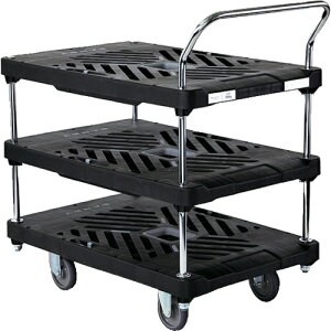 滑らかな動きをする3段式カート、樹脂製で扱いやすい。ブラック。●軽量でスムーズな動きをする3段式カートです。●ノックダウン式で、梱包サイズもコンパクトになっています。●組み立ても簡単で、棚板の4隅に支柱を差込むと完成しま