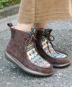フォークロアな雰囲気がたまらないモカシンブーツ ころんとした丸みのあるフォルムが可愛らしい雰囲気。 フロント部分に幾何学柄のゴブラン素材が存在感抜群です♪ 土踏まず部分がフィットする立体インソールと、とっても軽いソールを