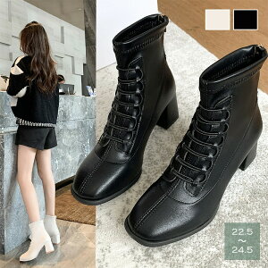 チャンキーヒール きれい 美脚 カジュアル 大人 合皮 バックファスナー 歩きやすい 履きやすいシンプルでベーシックなレースアップ風のスクエアトゥショートブーツ。安定感があり疲れにくいのでヘビロテ間違いなし