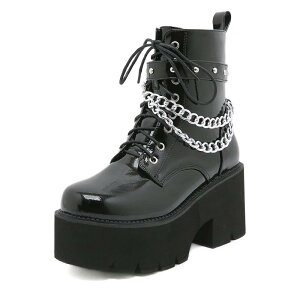 ブーツ レディース ショートブーツ 厚底 太ヒール ハイヒール サイドジップ メタル チェーン飾り 鋲 スタッズ 合皮 ラウンドトゥ 婦人靴 秋冬 ブラック 大サイズ
