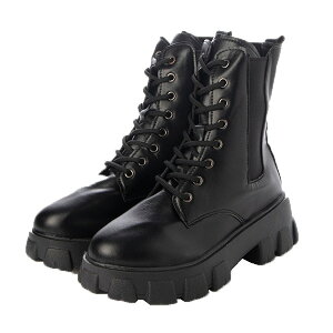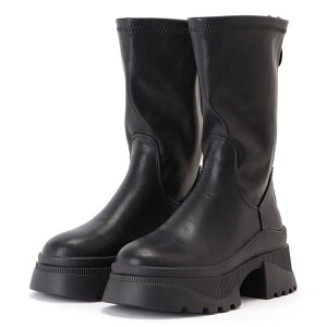 レザー調素材でおつくりした厚底ブーツ。シルエットを際立たせるシンプルなデザインで、足元にさりげなくトレンド感をプラスしてくれる一足です。凹凸のあるトラックシューズでやや辛口に仕上げた表情は、今シーズン人気のミリタリー