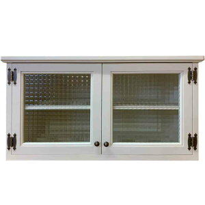 ホワイトのオイルステインで仕上げ、木の風合いそのまま生かしたナチュラルなキッチン吊戸棚です。 飾り扉にはチェッカーガラスに桟が入ってとってもいい雰囲気。食器もオシャレにディスプレイできます。 このキャビネットは大きめで