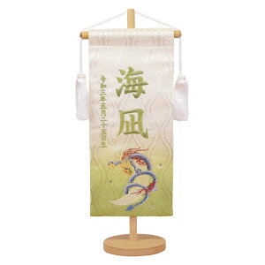 男の子の節句に五月人形と一緒に飾る 「お名前旗」です。 高級感のある京都西陣織金襴を使用し、 総刺繍で青龍を施した 爽やかな日本製のお名前旗です。 お名前を青色文字刺繍でお入れします。 高さ39センチの木製スタンド付きです。 通