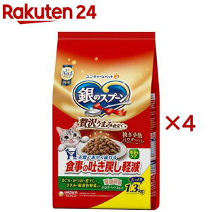 メーカー:ユニチャーム品番:66377食事の吐き戻しを軽減する世界初のドライフード!銀のスプーン 食事の吐き戻し軽減フード まぐろ・かつお・煮干し・ささみ・緑黄色野菜入り 1.3kg(小分けパック4袋入)対象猫タイプドライフード機