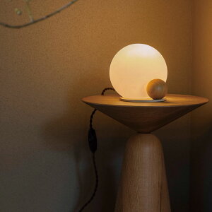 日々の暮らしのひとときを、心地よく充実したものとするお手伝いをしたい。そんな思いを込めた照明器具です。 2つのボールが寄り添う、アートオブジェのような丸いフォルムのテーブルライト。ウッドボールに沿うように絶妙なカーブを
