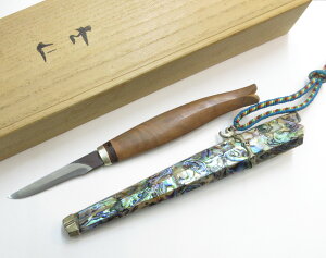 40年ぐらい前にご自分で高名な書道家の為に鍛造製作されたそうです。(ご本人伝)全長:220mm、ブレード:80mm、材質:鋼鉄、ケヤキハンドル。メキシコ貝装飾&銀製金具止め木鞘、織布袋、桐箱が付属します。